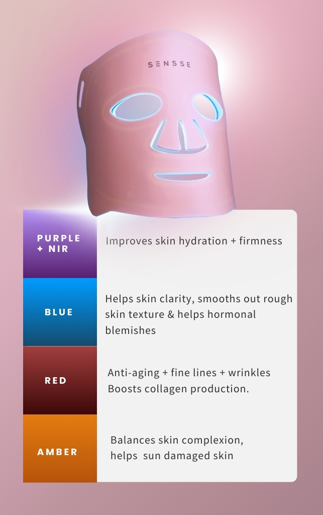 SENSSE was developed for improving multiple skin concerns. Made with advanced 270 LED light technology, this face mask has 4 pre-programmed LED colour treatment modes (RED, BLUE, AMBER, and PURPLE + NIR) created to fight off your deepest skin insecurities. Each colour light programme is designed to target a specific skin concern. The LED mask emits light at specific wavelengths and frequencies that can deeply penetrate the skin, depending on the light colour selected. Each light colour targets specific cells and has its own results helping to improve most skin concerns.